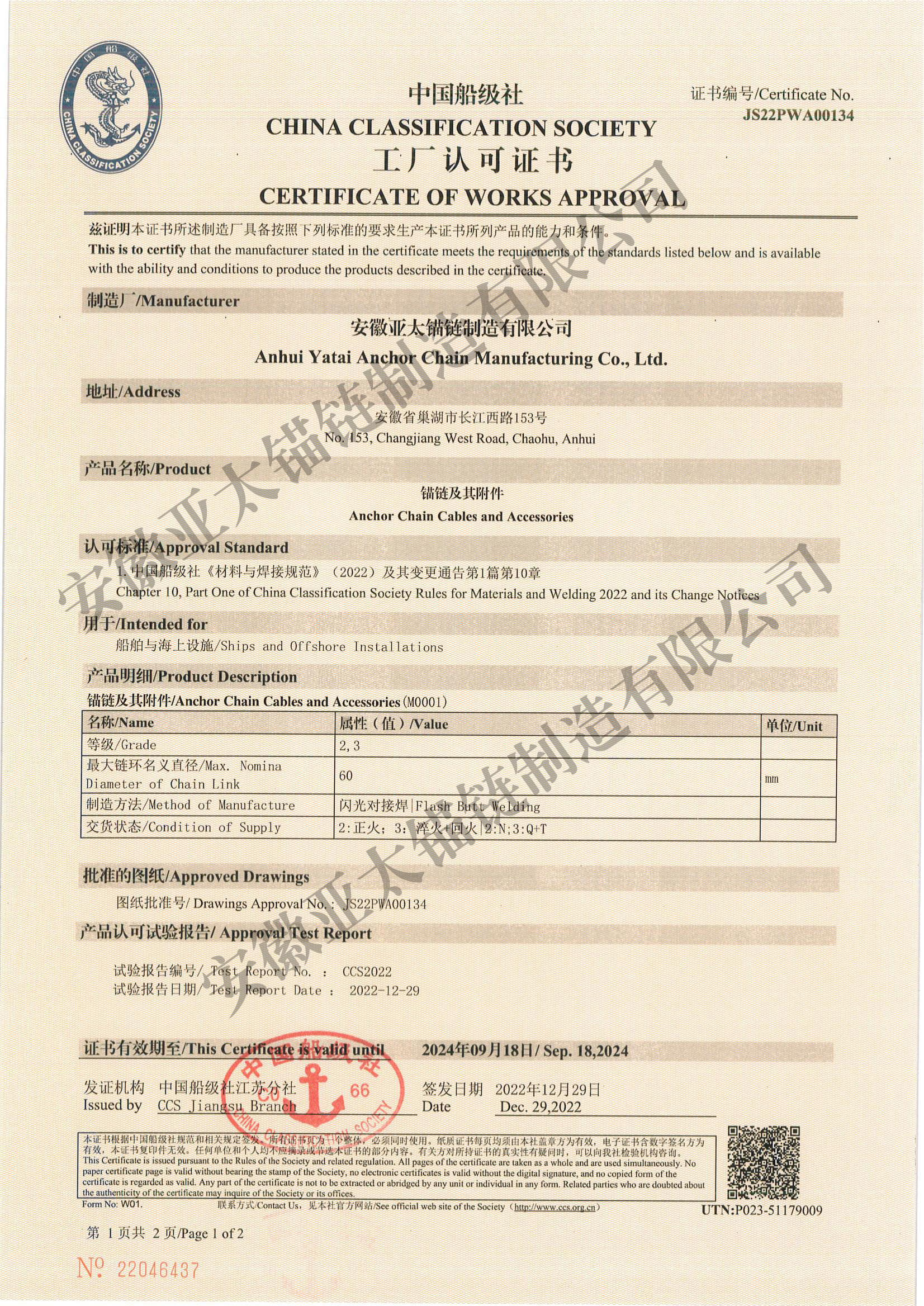 安徽亞太錨鏈制造有限公司是國家高新技術企業,也是國家GB/T 549-2017《電焊錨鏈》標準的起草和制定單位之一。公司旗下設有錨鏈分廠、浮標分廠、舾裝件分廠等多個分廠。公司專業從事φ12.5mm-φ107mm二、三級船用錨鏈、浮標錨鏈、錨鏈附件,錨、船舶曬裝產品、航標、系船浮、船型標、多種規格海洋監測浮標及航標燈等產品的生產、安裝和服務。目前公司的產品銷往全國各地船廠、碼頭、航標處、航道局、海洋局,并已走上國際市場,如東南亞、中東、歐美等國家。